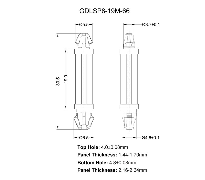 | 43722 | GDLSP8-19M-66 | PA66 UL94V2 | Tự nhiên | 4.0 +/- 0.08 | 4,8 +/- 0,08 | 1,44-1,7 | 2,16-2,64 | 1000 | GDLSP8-19M-66 | ![]() |