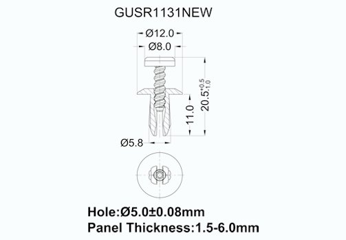Đinh tán vặn vít, Đinh tán vặn vít, Bắt chéo, Kích thước lỗ 5.0 +/- 0.08, Phạm vi kẹp 1.5-6.0, PA66 UL94V2